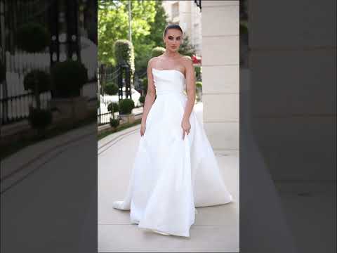 The natural waistline flows seamlessly into a voluminous A-line skirt, providing a timeless and regal appearance. The smooth satin fabric ensures a stunning drape, creating a breathtaking train that glides effortlessly with every step. “Cassandra” is a perfect blend of classic charm and contemporary elegance, making it an unforgettable choice for your special day.